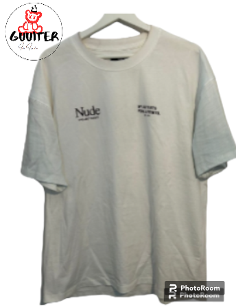 Samarreta de mànigues curtes de color blanc penjada en el que sembla ser un penjador negre contra una paret de color clar. La samarreta té text imprès en una font negra. A la part superior esquerra del pit, es llegeix "Nude" amb un text més petit a sota que diu "productions". A la part dreta del pit, hi ha un altre text que diu "BY ARTISTS FOR ARTISTS" en una alineació vertical.